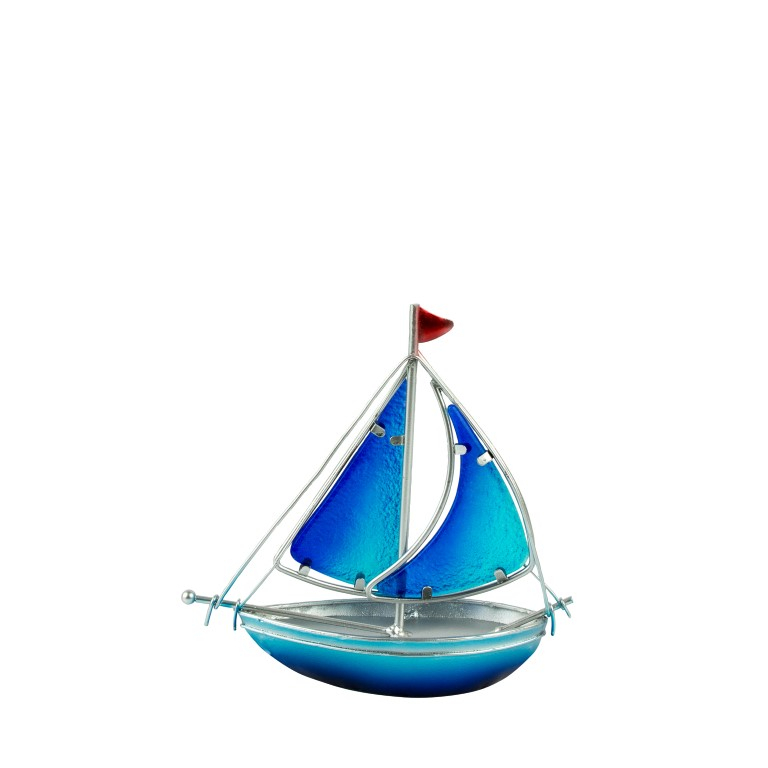 Zeilboot van metaal met een zeil van blauw glas 22 cm lang bij 27 cm hoog
